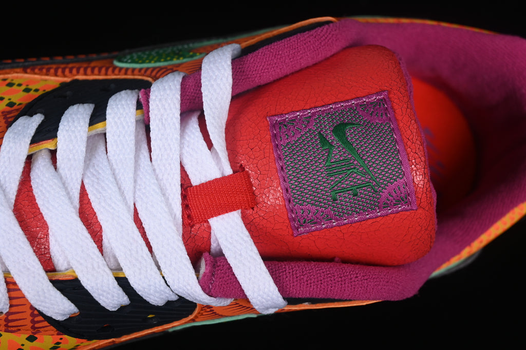 O cabedal mistura materiais premium e uma paleta de roxo, laranja, amarelo e rosa, inspirada nas oferendas e flores de cempasúchil. A entressola branca com unidade Air visível garante conforto duradouro, enquanto os acabamentos bordados e gráficos únicos tornam cada par uma verdadeira obra de arte.