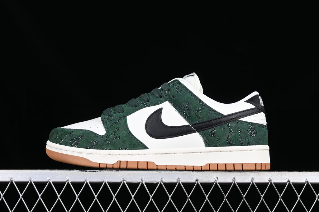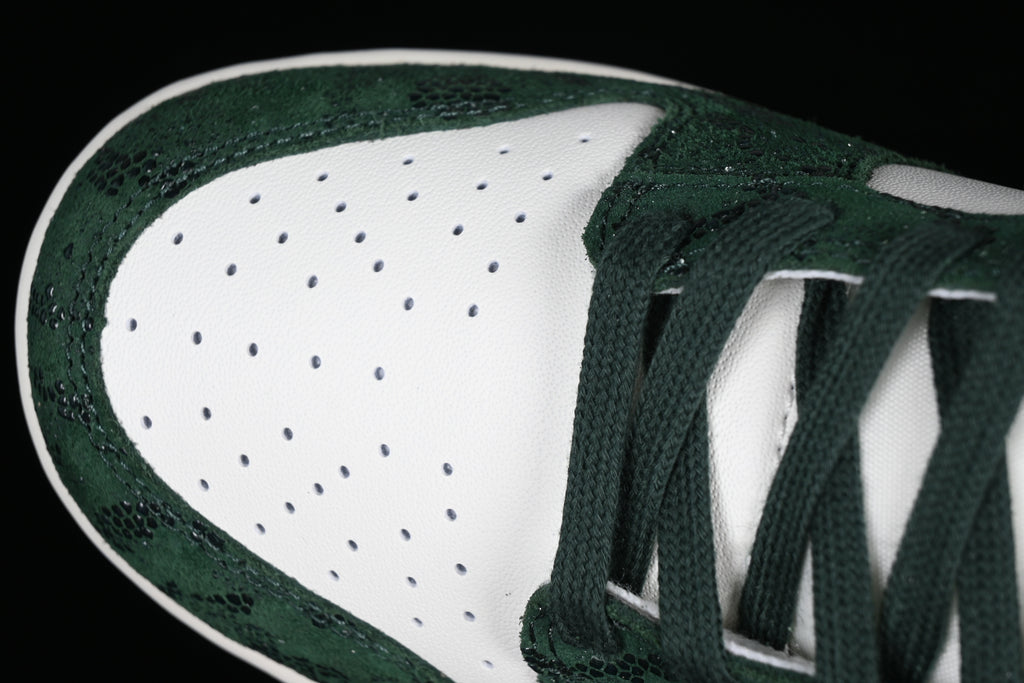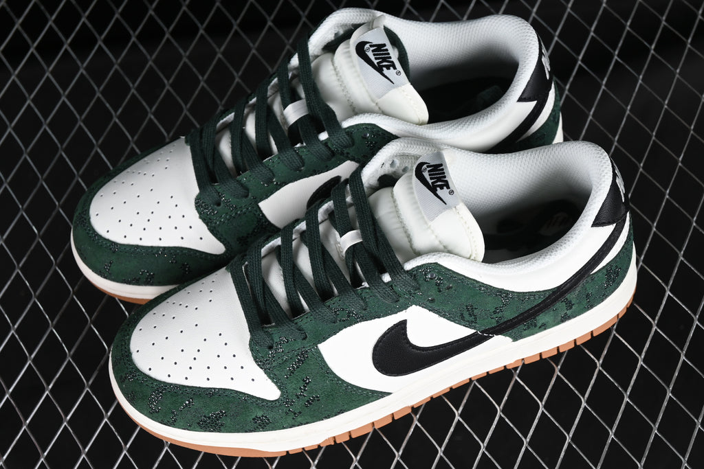 O “Green Snake” eleva o design clássico do Dunk com uma combinação exótica e sofisticada. A base branca contrasta com sobreposições em verde escuro texturizado, inspiradas na pele de cobra, criando um visual marcante e elegante.