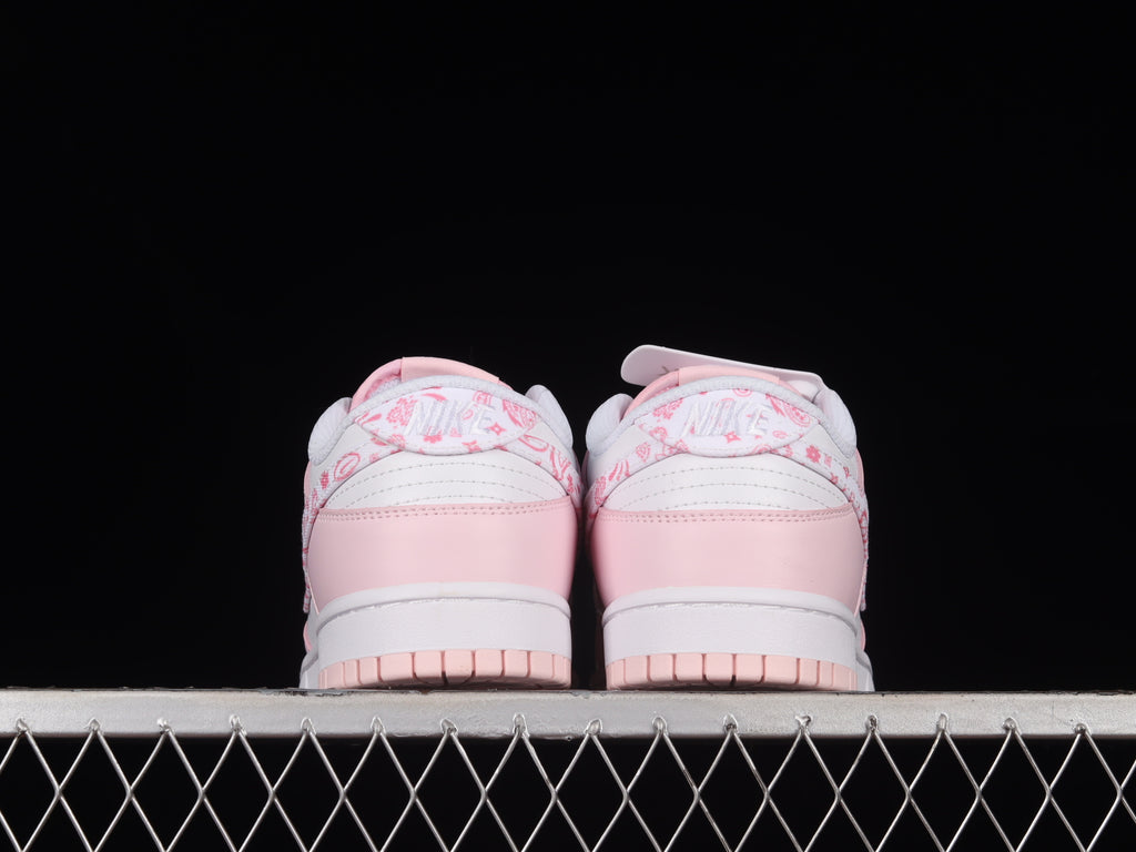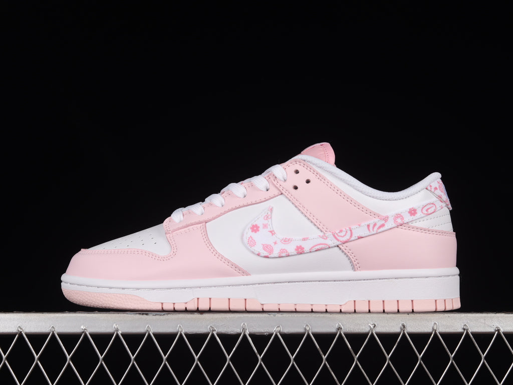 O Nike Dunk Low “Paisley Pack Pink” combina uma base em couro branco premium com sobreposições em rosa suave, e o Swoosh em estampa paisley — um detalhe que traz personalidade e elegância retrô ao design clássico do Dunk.