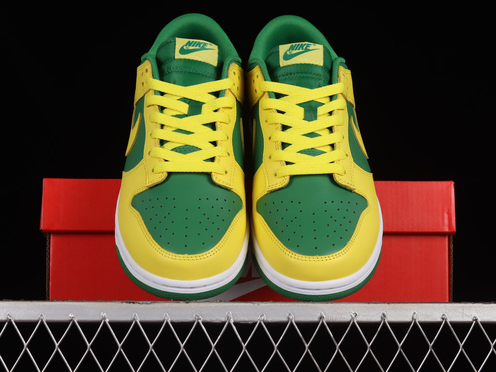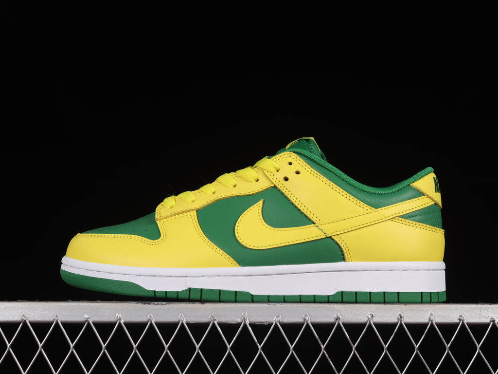 O Dunk Low “Reverse Brazil” reinventa o tradicional esquema de cores do Brasil, invertendo o padrão clássico para um visual ousado: base em verde vivo com sobreposições em amarelo intenso, mantendo o espírito icônico da bandeira em cada detalhe.