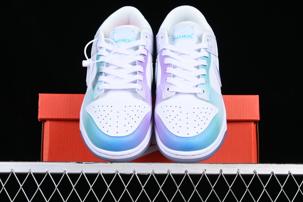 O “Unlock Your Space” traz uma abordagem futurista e ousada à silhueta clássica do Dunk. A base branca com sobreposições em tons metálicos iridescentes reflete diferentes cores conforme a luz, criando um visual dinâmico e tecnológico. Detalhes em roxo e verde-acqua complementam o design, reforçando sua estética inspirada no universo digital.