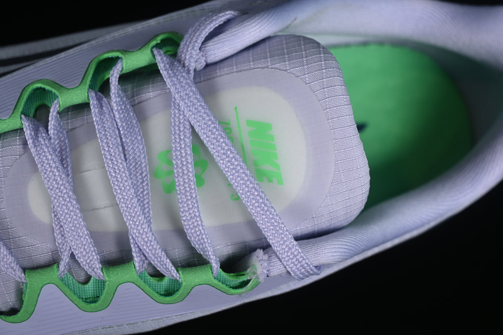 O “Oxygen Purple” traz uma paleta vibrante e sofisticada ao design moderno da Zoom Fly 5. A malha leve no cabedal core é complementada por tons de roxo suculento (Oxygen Purple) e detalhes escuros em Indigo Haze, resultando em um visual ousado e equilibrado.