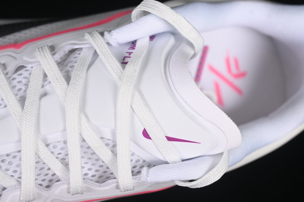 O “Vivid Grape / Hyper Pink” combina uma paleta vibrante e cheia de vida com o desempenho de elite da Zoom Fly 6. A malha superior branca mescla-se a detalhes em roxo vibrante (Vivid Grape) e rosa neon (Hyper Pink), criando um visual moderno, dinâmico e impactante.